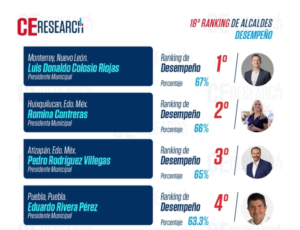 Este ranking de desempeño está basado en el promedio que arrojan las calificaciones de los ciudadanos hacia el trabajo que ha realizado su gobierno, en materia de recolección de basura, alumbrado público, mantenimiento de la ciudad, bacheo y atracción de inversiones.